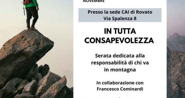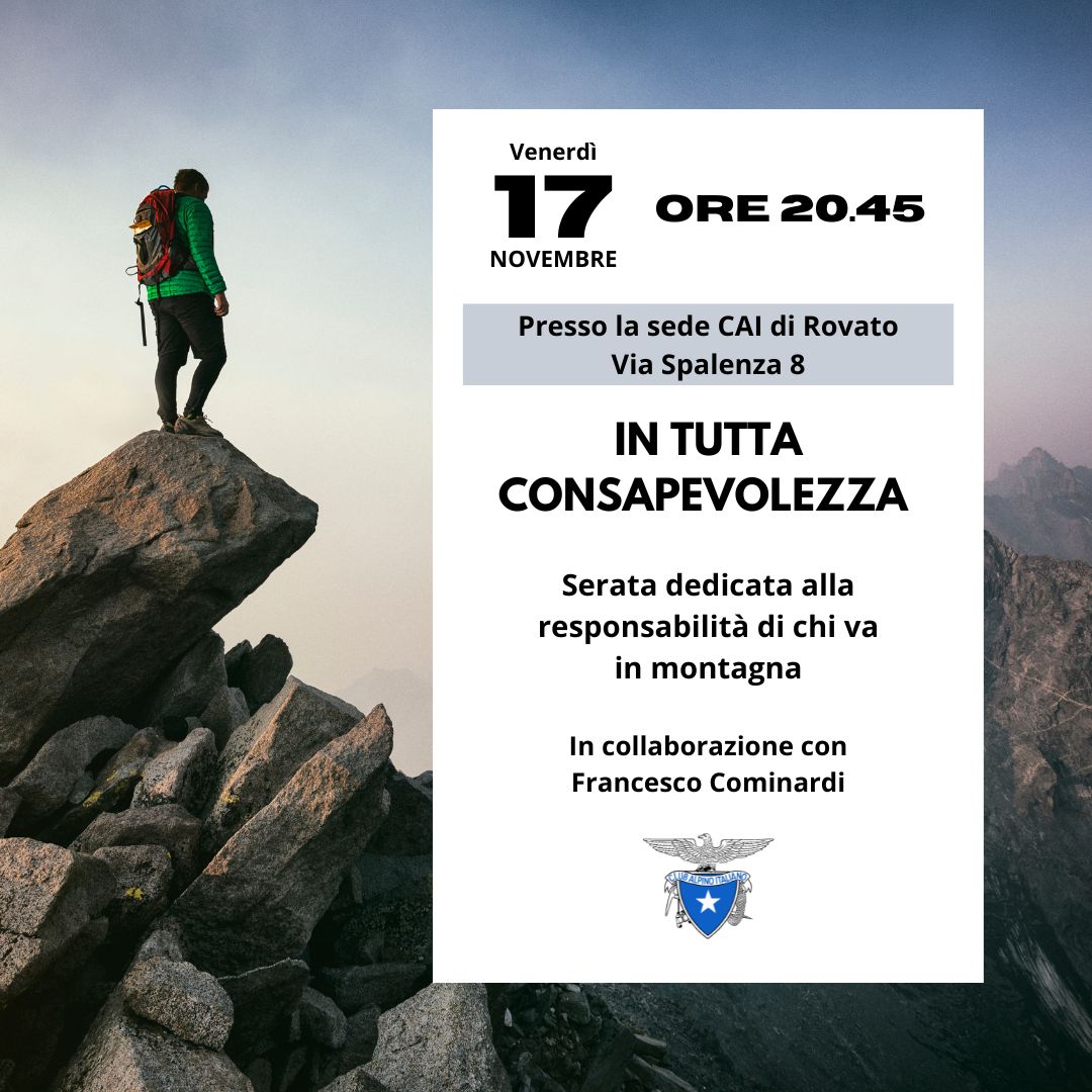 Incontro sulla sicurezza in montagna, questa sera alle 20.45, nella sede del Cai di Rovato. “Durante questa serata si parlerà di Responsabilità e Assicurazioni con l’aiuto di due interventi registrati, durante un congresso nazionale del CAI centrale. Evento aperto a tutti i soci e non”