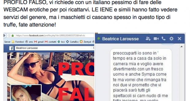 L’allarme è partito dal rovatese Giordano Fava di Pc-Brescia. Nei giorni scorsi diversi rovatesi avrebbero accettato su Facebook la richiesta di amicizia di tale “Beatrice Larousse”, avvenente fanciulla che – nella chat privata – si dice pronta a webcam erotiche con prestazioni indicibili. Peccato si tratti di una truffa notissima già denunciata dalla Polizia postale e da trasmissioni come le Iene: le donne, gestite da un’organizzazione criminale, invitano il malcapitato in chat e lo convincono a spogliarsi, poi minacciano di diffondere i filmati in migliaia di siti se questo non paga una certa cifra. Quindi, cari rovatesi, occhio a Beatrice e alle sue amiche!