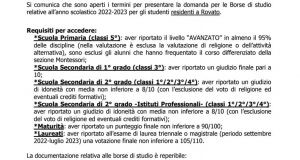 Il Comune comunica che sono aperti i termini per presentare la domanda per le Borse di Studio relative all’anno scolastico 2022-2023 per gli studenti residenti a Rovato. Nel link trovate tutte le informazioni utili: https://www.comune.rovato.bs.it/cittadino/diritti-dei-cittadini/notizia/borse-di-studio-comunali-merito-anno-scolastico-20222023?
