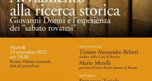 Martedì 13 Settembre alle ore 18.00 presso il Salone del Pianoforte del Palazzo Comunale verrà presentato il volume Avviamento alla ricerca storica-Giovanni Donni e l’esperienza dei “sabato rovatesi” con la partecipazione di numerosi ospiti a cui seguirà un momento conviviale.
