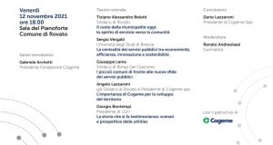 Venerdì 12 novembre alle ore 18:00, nella sala del pianoforte della casa comunale, si terrà la tavola rotonda “Cogeme: mezzo secolo a servizio dei Comuni”, per ricordare i 50 anni della fondazione dell’azienda multiutility che ha contribuito significativamente alla crescita di Rovato e del suo territorio. Interverranno tra gli altri: il sindaco di Città di Rovato Tiziano Belotti, Giorgio Bontempi ...