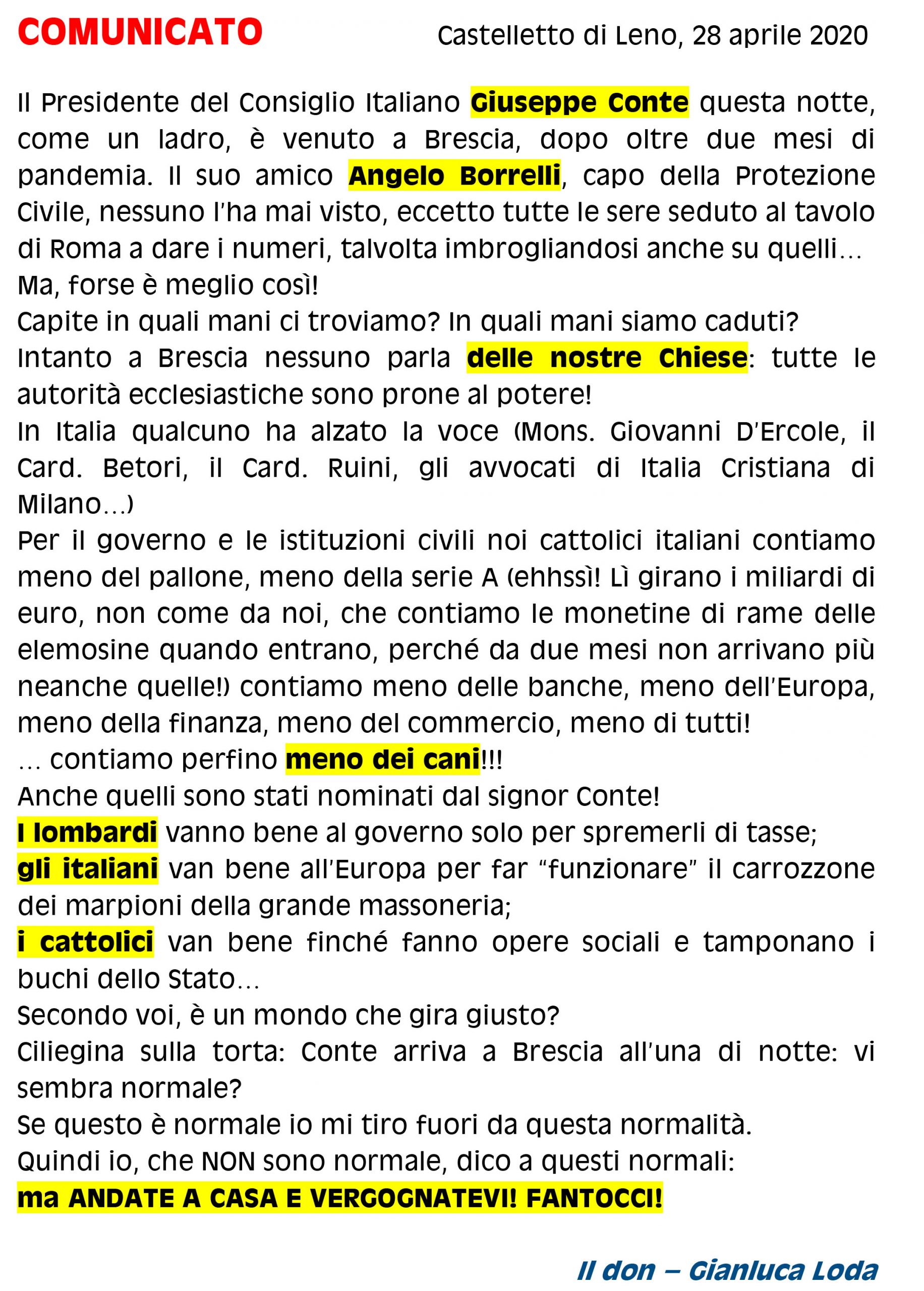 Secondo quanto riportato da Brescia News, infatti, don Loda nella nota ha criticato duramente il governo per lo stop alle messe, dicendo: “contiamo meno dei cani! Anche quelli sono stati nominati dal signor Conte” e ancora “andate a casa e vergognatevi fantocci!”.