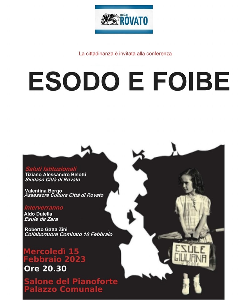 Mercoledì 15 Febbraio alle ore 20.30 presso il Salone del Pianoforte del Palazzo Comunale, si terrà la conferenza dal titolo “Esodo e Foibe” con la testimonianza diretta del Sig. Duiella Aldo, esule da Zara.
