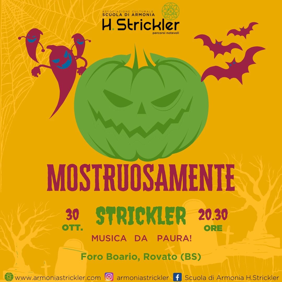 La Scuola di Armonia H. Strickler ha organizzato per  il 30 ottobre: “Mostruosamente, musica da paura”, un evento melodico ovviamente a tema Halloween. L’appuntamento è alle 20.30 al Foro Boario. Ulteriori informazioni sui canali ufficiali dell’associazione rovatese.