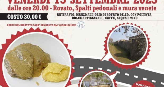 Venerdì 15 settembre torna a Rovato Il chilometro del Manzo all’olio. La cena comprende un menu composto da antipasto, Manzo all’olio De.Co con polenta, dolce artigianale, acqua e vino. Il costo è di 30 euro e il biglietto va acquistato all’Ufficio commercio del Comune entro il 12 settembre (030.7713223).