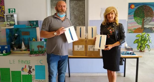 Gli assessori Pieritalo Bosio e Daniela Dotti hanno consegnato oggi alla dirigente scolastica, professoressa Archetti, alcuni tablet donati dall’Amministrazione comunale, affinché siano utilizzati per il potenziamento della didattica a distanza.