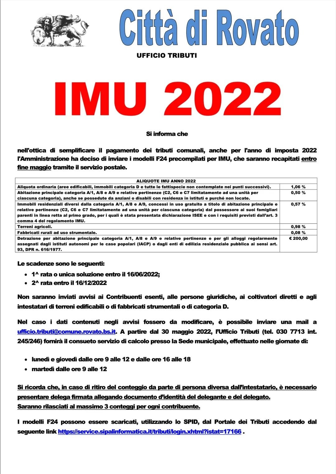 Il Comune di Rovato informa che, nell’ottica di semplificare il pagamento dei tributi comunali, anche per l’anno di imposta 2022, l’Amministrazione ha deciso di inviare i modelli F24 precompilati per IMU, che saranno recapitati entro fine maggio tramite il servizio postale.