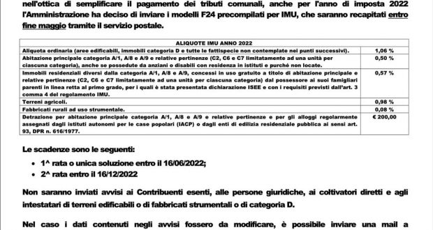 Il Comune di Rovato informa che, nell’ottica di semplificare il pagamento dei tributi comunali, anche per l’anno di imposta 2022, l’Amministrazione ha deciso di inviare i modelli F24 precompilati per IMU, che saranno recapitati entro fine maggio tramite il servizio postale.