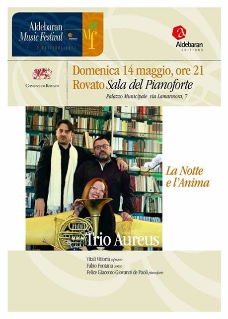 Secondo appuntamento con il festival Aldebaran a Rovato. Domenica 14 maggio alle ore 21 il trio Aureus si esibirà in un repertorio d’eccezione. Il trio è composto dalla soprano Vittoria Vitali, dal pianista Felice Giacomo Giovanni de Paoli e dal corno del nostro Fabio Fontana, insignito lo scorso novembre della benemerenza cittadina durante la cerimonia del Leone d’Oro.
