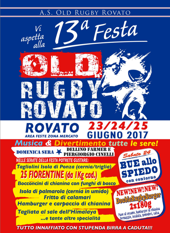 Venerdì, sabato e domenica a Rovato si terrà la 13esima edizione della festa Old Rugby Rovato, ospitata dall’area feste della zona mercato. La serata clou sarà quella di domenica quando sul palco si esibiranno due pezzi da novanta della musica bresciana: Piergiorgio Cinelli e il rapper Dellino Farmer. Nella stessa serata verrà offerto anche un menu particolare: sul piatto ci sono 25 fiorentine da un chilo, tagliolini di cernia e altre specialità poco frequenti nelle feste popolari. Mentre sabato verrà anche servito il bue allo spiedo.