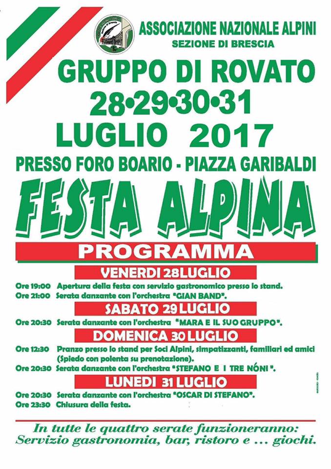 Questo fine settimana a Rovato c’è la festa degli alpini. La festa delle penne nere si è aperta venerdì 28 e proseguirà fino a lunedì 31 luglio. Ricco stand gastronomico e sarete danzanti con orchestra. Il programma prevede per venerdì l’orchestra Gian Band, per sabato l’orchestra “Mara e il suo gruppo”, per domenica, per domenica “Stefano e i tre nòni” e per lunedì Oscar di Stefano. La festa, ovviamente, sarà caratterizzata anche dagli stand enogastronomici e dal pranzo conviviale della domenica (spiedo con polenta su prenotazione).