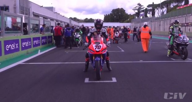 Dopo un Warm Up tranquillo, in Gara 2 Manuel parte ancora in seconda fila ed è subito spettacolo. Sempre all’interno del gruppo di testa, lotta agguerrito con gli importanti nomi del campionato mentre la sfida si fa intensa con cadute e colpi di scena in una gara carica di tensione con il titolo in palio. Le sorprese cominciano già nei primi giri, con Nicola Settimo (Prodina Ircos Kawasaki) out per una caduta a seguito di un contatto con Bastianelli. Il nostro rovatese, sino al 9° giro, combatte all’interno del gruppo di testa portandosi in 3^ posizione, poi caduta alla curva Roma con il pilota Emanuele Vocino (GradaraCorse PZracing), uno dei protagonisti del Campionato. Rammarico per la caduta ma grande soddisfazione per l’andamento della Gara; Rocca si dimostra un pilota di razza con i numeri giusti per un futuro important