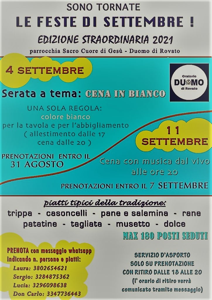 Appuntamento a settembre per le feste all’oratorio della parrocchia Sacro Cuore di Gesù, al Duomo di Rovato. Il 4 si terrà infatti la cena in bianco (prenotazioni entro il 31 agosto), mentre l’11 è prevista una cena con musica dal vivo (prenotazioni entro il 7 settembre). Entrambi gli eventi culinari saranno a base di piatti tipici della tradizione bresciana, con massimo 180 posti a sede e asporto su prenotazione. Nella locandina qui sotto trovate tutti i dettagli.