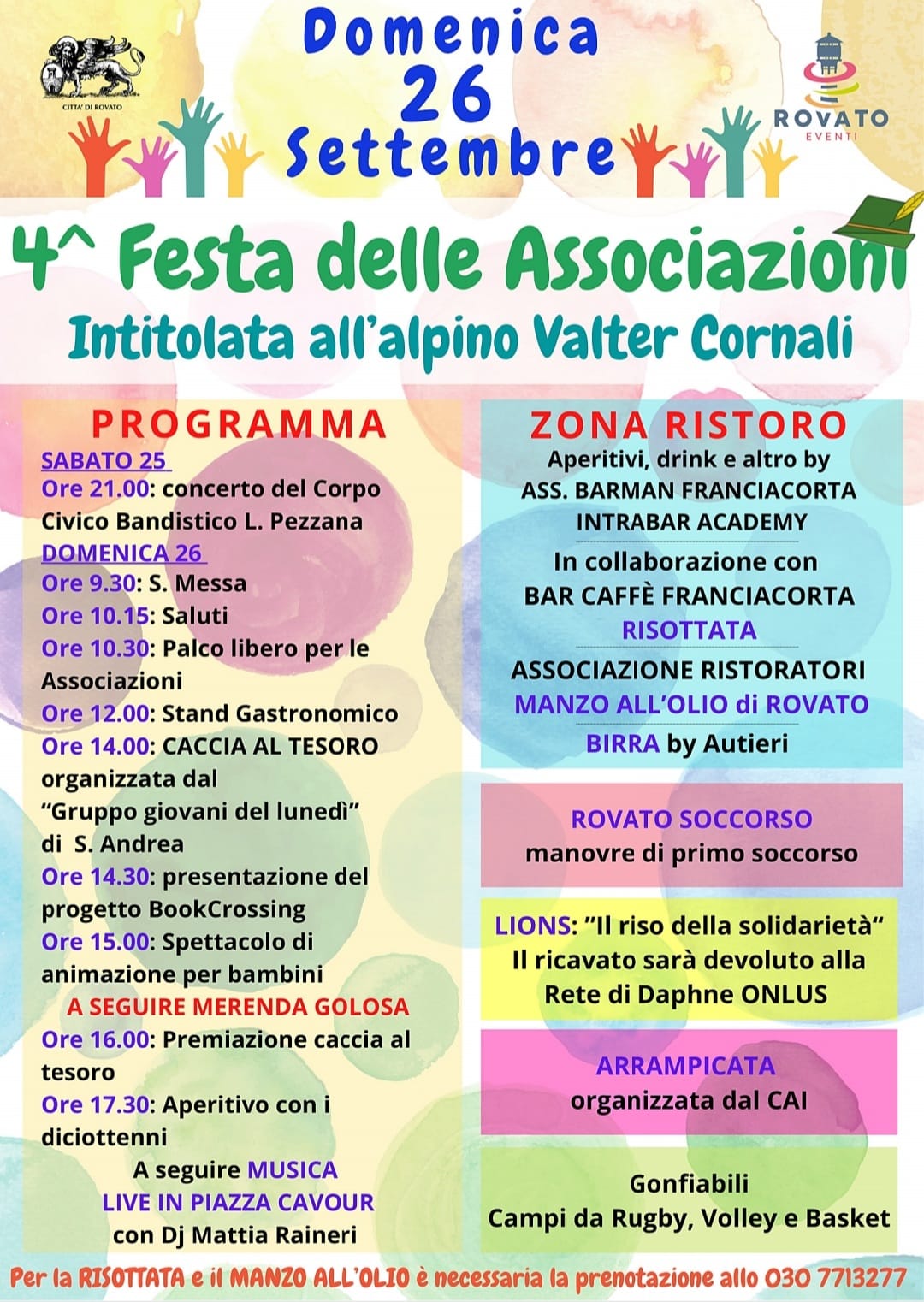 Appuntamento con la festa delle associazioni, domenica 26 settembre, a Rovato. L’evento sarà dedicato all’alpino Valter Cornali, recentemente scomparso. Nell’occasione piazza Cavour ospiterà un ricco programma di eventi che si aprirà la mattina e si chiuderà la sera, tra musica, stand gastronomici, esibizioni sportive, occasioni di formazione e solidali, spazi con gonfiabili per i bimbi etc.
