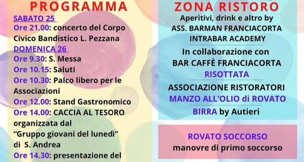 Appuntamento con la festa delle associazioni, domenica 26 settembre, a Rovato. L’evento sarà dedicato all’alpino Valter Cornali, recentemente scomparso. Nell’occasione piazza Cavour ospiterà un ricco programma di eventi che si aprirà la mattina e si chiuderà la sera, tra musica, stand gastronomici, esibizioni sportive, occasioni di formazione e solidali, spazi con gonfiabili per i bimbi etc.