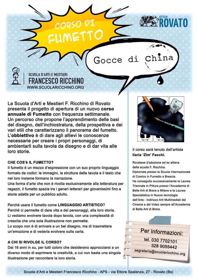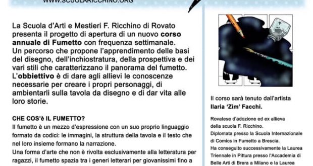 La scuola Ricchino di Rovato propone un corso annuale di fumetto con frequenza settimanale. Trovate tutte le informazioni disponibili sul depliant che pubblichiamo qui sotto.