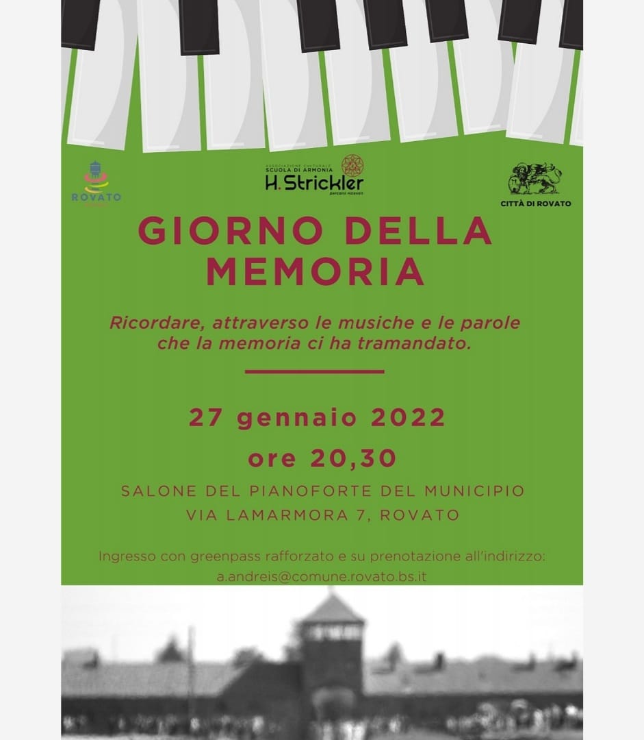 In occasione della giornata della Memoria, giovedì 27 gennaio alle ore 20:30 nel salone del pianoforte del palazzo municipale, la scuola di armonia Strickler, con il patrocinio e la collaborazione di Città di Rovato, organizzerà un momento di riflessione fatto di musica e di parole per ricordare la tragedia della Shoah.