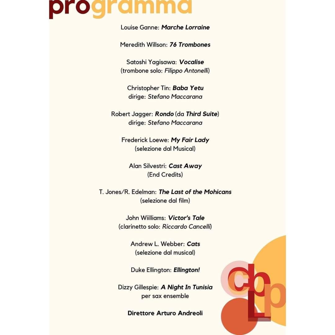 Presso il cortile del Palazzo Comunale di via Lamarmora sabato 21 maggio alle ore 21.00 si terrà il tradizionale concerto di primavera, diretto da Arturo Andreoli. Di seguito il programma musicale.