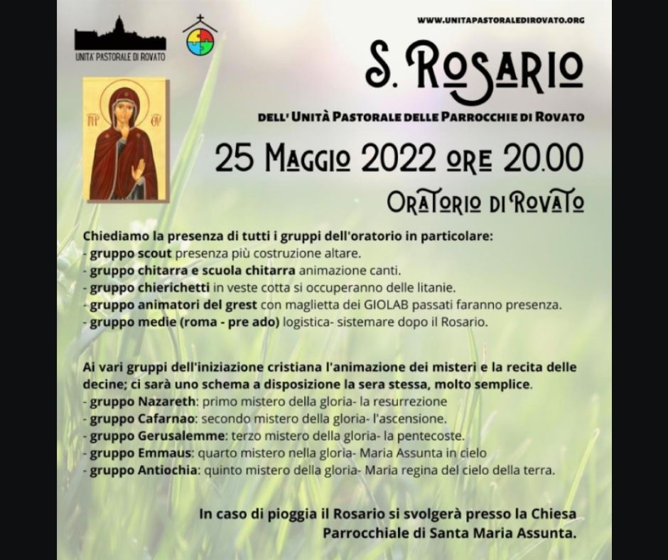 Mercoledì 25 maggio, dalle 20, l’oratorio di Rovato centro ospiterà il rosario alla presenza di gruppo scout, gruppo chitarra, chierichetti, animatori del Grest e gruppo scuole medie. In caso di pioggia l’evento si terrà nella chiesa parrocchiale.