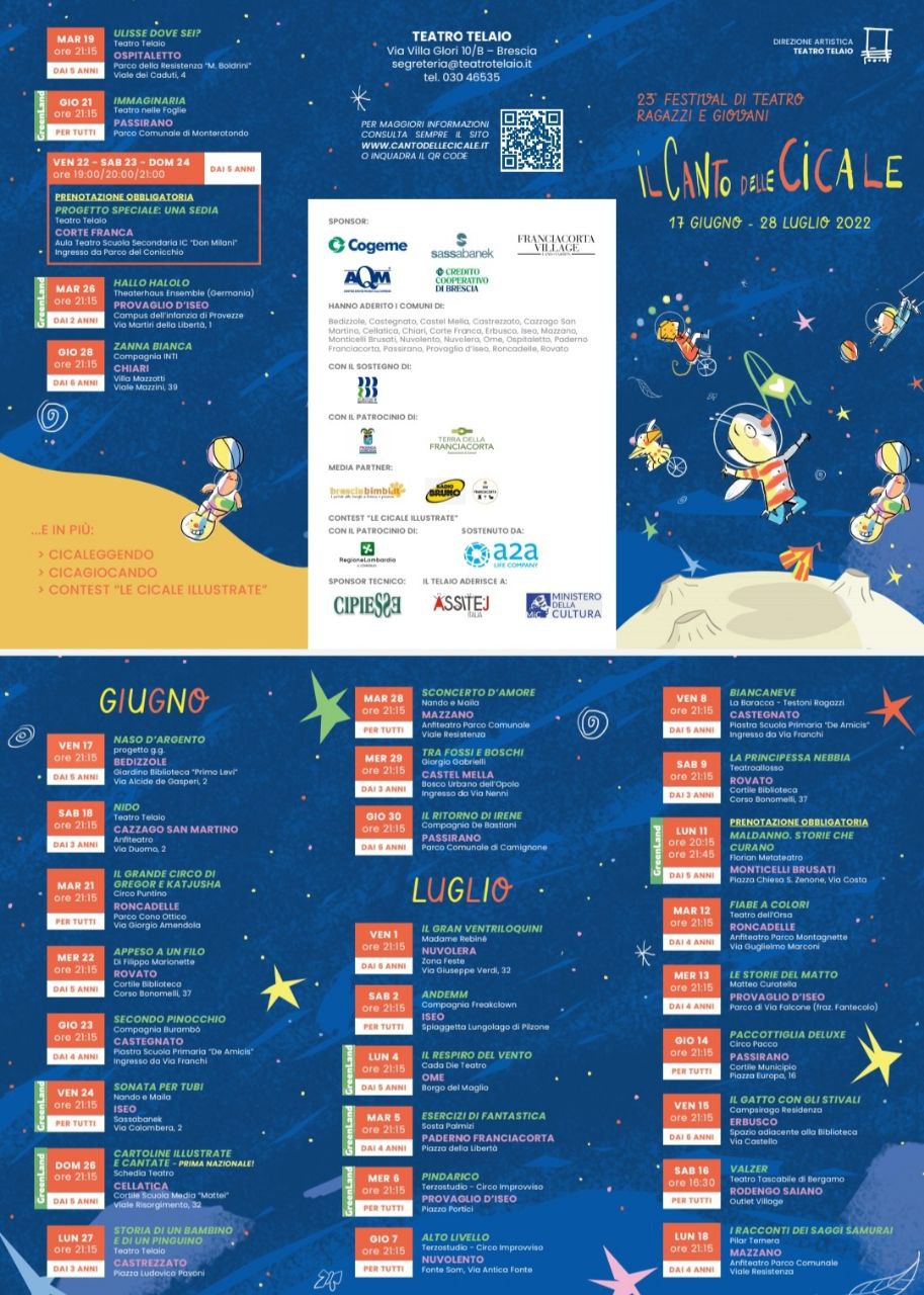 Torna anche quest’anno il tradizionale appuntamento con Il Canto delle Cicale, festival teatrale a cura del Teatro Telaio. Due gli appuntamenti che coinvolgono la Città di Rovato: 22 Giugno e 9 Luglio presso il giardino della Biblioteca.