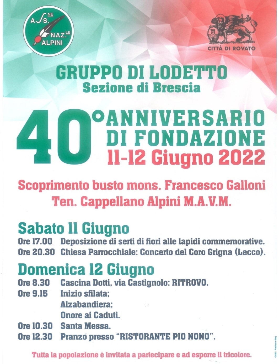 Nelle giornate di sabato 11 e domenica 12 giugno nella frazione rovatese si celebrerà il 40° anno di fondazione della sezione Alpini di Lodetto. In questa occasione verrà scoperto un monumento dedicato a Mons. Francesco Galloni, cappellano alpino lodettese. La messa verrà celebrata nella via a lui intitolata e dove è stato anche posato il monumento. Nella locandina il programma completo. FONTE: COMUNE