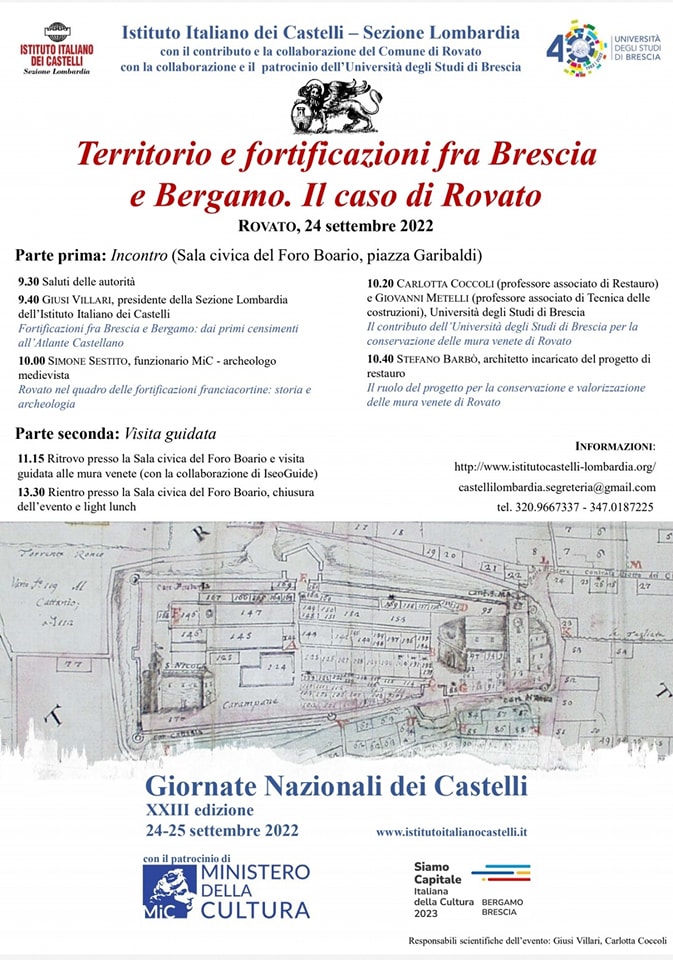 Sabato 24 Settembre alle ore 9.30 presso la Sala Civica Foro Boario si terrà il convegno: “Territorio e fortificazioni fra Brescia e Bergamo. Il caso di Rovato”, organizzato dall’Istituto Italiano dei Castelli – Sezione Lombardia, con la collaborazione ed il patrocinio dell’Università degli Studi di Brescia.