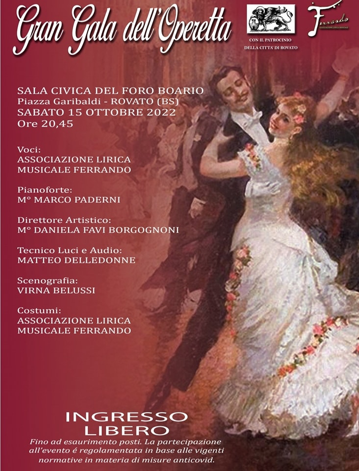 Sabato 15 Ottobre alle ore 20.45 presso la Sala Civica Foro Boario si terrà lo spettacolo Gran Galà dell’Operetta, un viaggio attraverso i personaggi delle più celebri operette a cura dell’Associazione Lirica Musicale Ferrando.