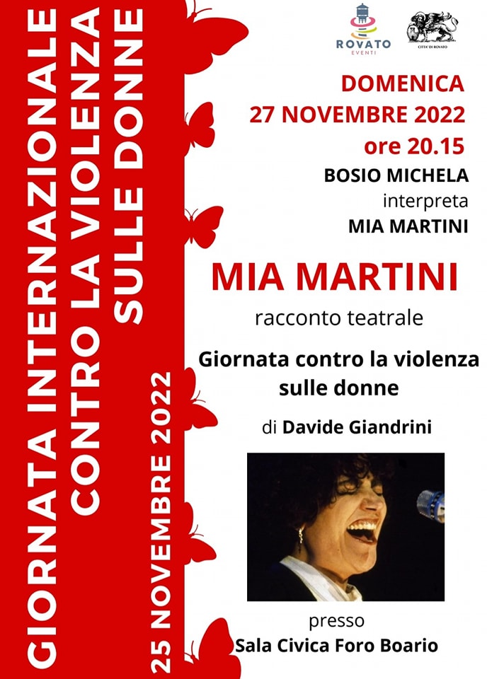 In occasione della Giornata internazionale contro la violenza sulle donne, domenica 27 novembre, Michela Bosio interpreta “Mia Martini – racconto teatrale”. Appuntamento alle 20.15 a Rovato, nella sala civica del Foro Boario. Ingresso libero.