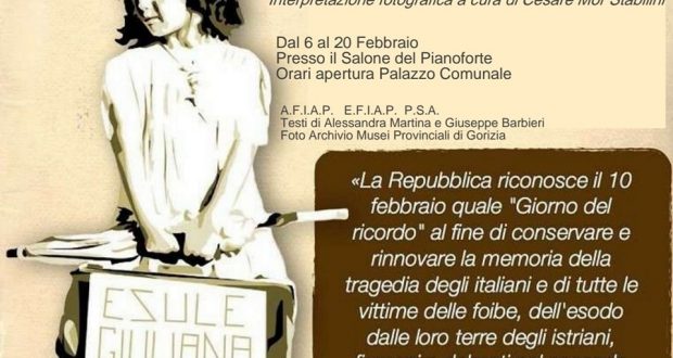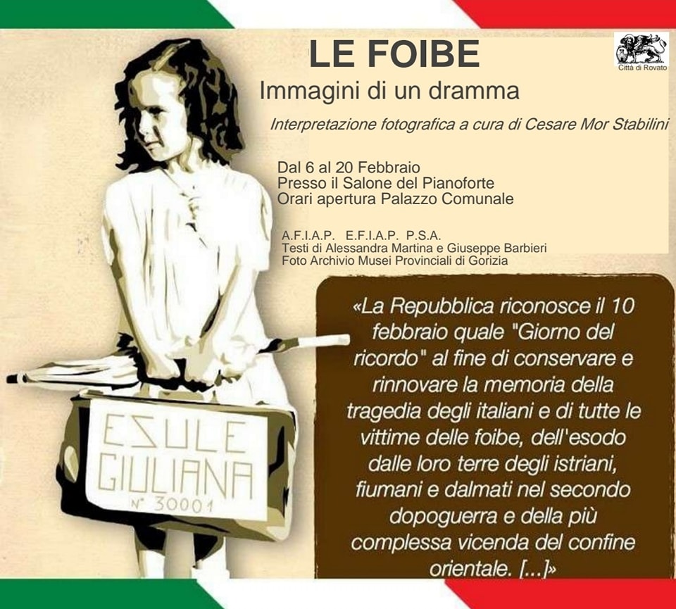 Da Lunedì 6 fino a Lunedì 20 Febbraio presso il Salone del Pianoforte del Palazzo Comunale, sarà installata la mostra fotografica dal titolo “Le Foibe-Immagini di un dramma” a cura di Cesare Mor Stabilini.