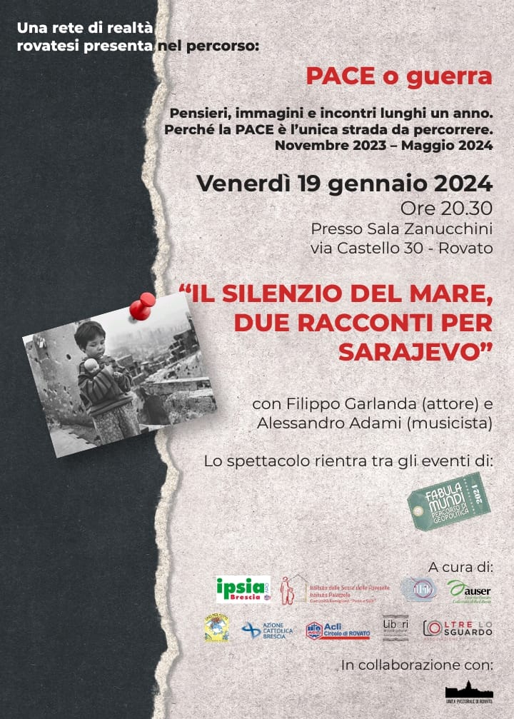 Il Circolo Acli di Rovato insieme ad altre realtà rovatesi, invitano alla visione dello spettacolo “Il silenzio del mare, due racconti per Sarajevo”. L’appuntamento è per il 19 gennaio, alle 20.30, nella sala Zenucchini di Rovato. Ingresso libero.
