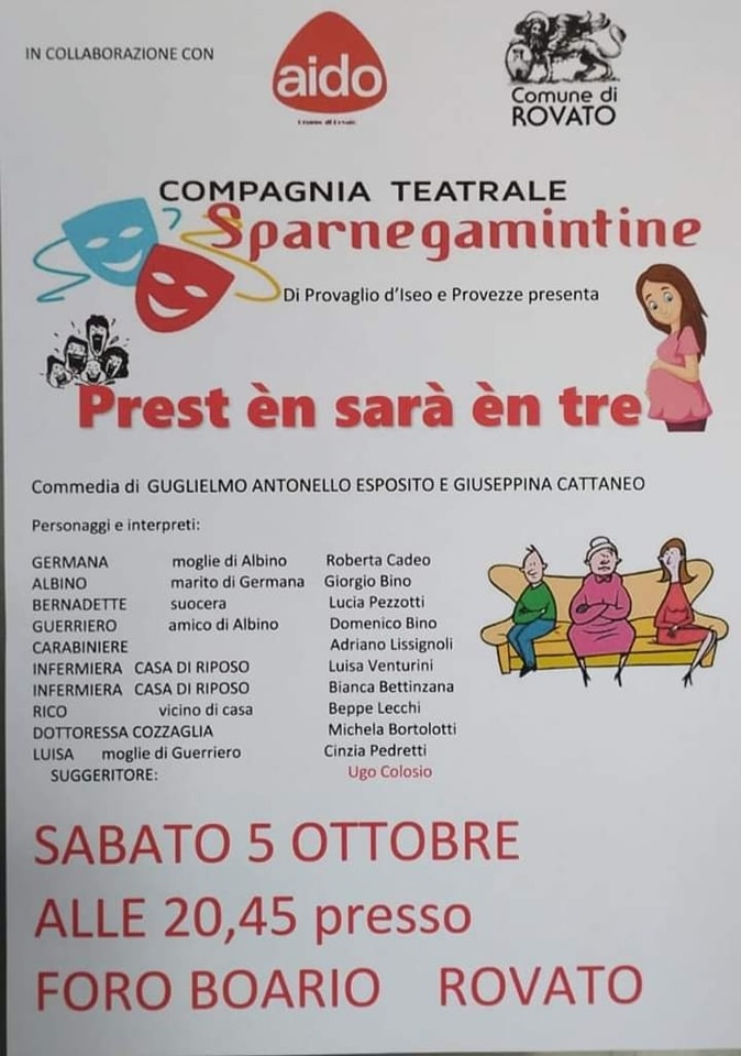 Sabato 5 Ottobre alle ore 20.45, presso la sala civica del Foro Boario, la compagnia teatrale “SPARNEGAMINTINE” di Provaglio d’Iseo e Provezze, presenta “PREST ÈN SARÀ ÈN TRE”, una simpatica commedia in dialetto bresciano.