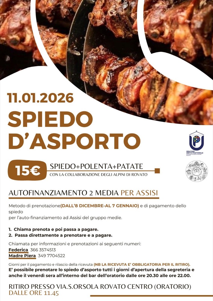 Domenica 11 gennaio 2026 torna a Rovato l’appuntamento con lo spiedo d’asporto, un’iniziativa gastronomica dal forte valore solidale promossa dall’oratorio nell’ambito delle attività di autofinanziamento della classe seconda media per il pellegrinaggio ad Assisi.