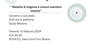 Il Coordinamento Pedagogico Territoriale Oglio Ovest è lieto di invitare la cittadinanza alla serata formativa “MALATTIE DI STAGIONE E COMUNI ESANTEMI INFANTILI”, incontro a cura della Dr.ssa in pediatria Giulia Messina, Venerdì 16 Febbraio alle ore 20.30 presso la Sala Civica della Città di Rovato . La partecipazione è completamente gratuita grazie ai fondi di Regione Lombardia. FONTE: COMUNE
