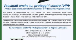 Il Comune informa che ATS Brescia organizza, in collaborazione con ASST Spedali Civili di Brescia, ASST Franciacorta, ASST Garda, una campagna di vaccinazione anti HPV, gratuita e senza appuntamento, sabato 4 marzo 2023 e nella settimana da lunedì 6 a venerdì 10 marzo 2023. La vaccinazione contro l’HPV previene l’infezione da Papilloma virus che è causa di diversi tipi di ...