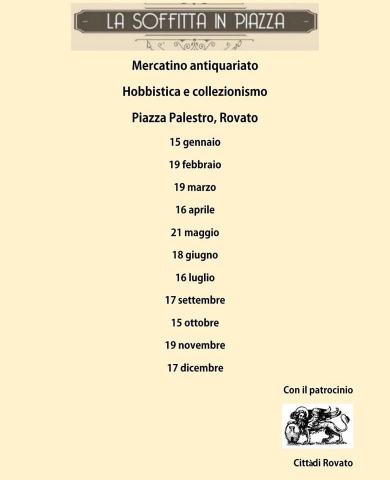 Di seguito pubblichiamo il calendario degli appuntamenti dell’evento “La soffitta in piazza”, mercatino di antiquariato, hobbistica e collezionismo che si tiene a Rovato in piazza Cavour.