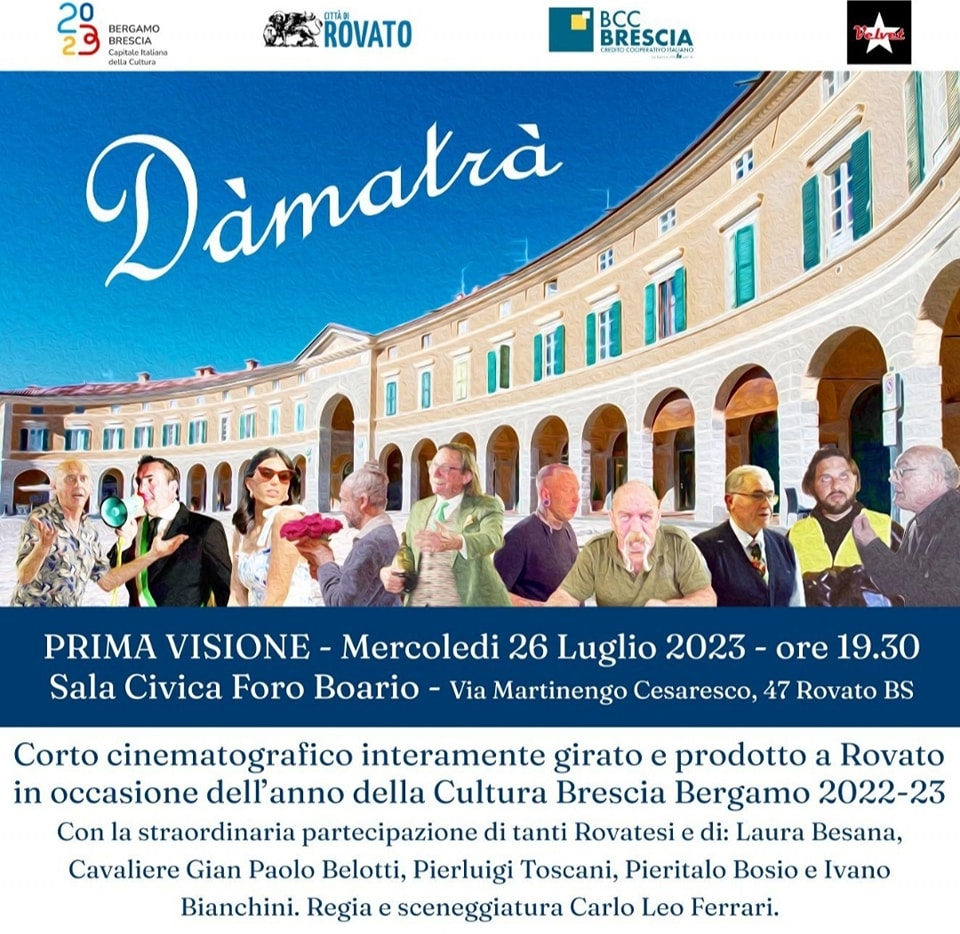 Mercoledì 26 luglio 2023 – alle 19.30, nella Sala Civica del Foro Boario – sarà proiettato Damatrà, corto cinematografico interamente girato e prodotto a Rovato in occasione dell’anno della Cultura Brescia Bergamo 2022-2023.