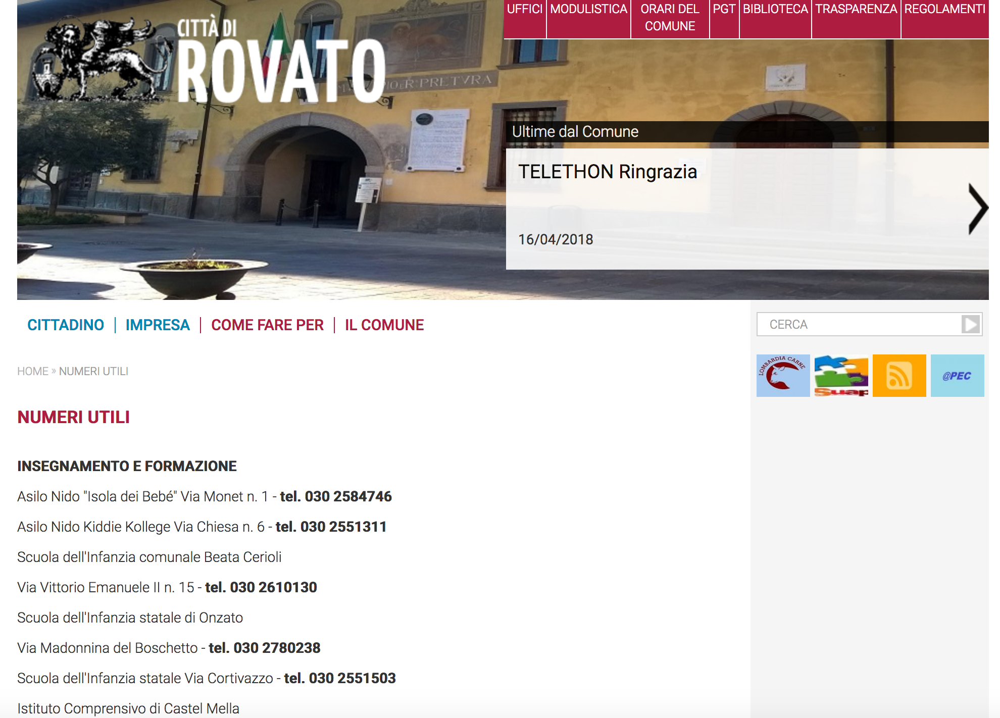 Problemi tecnici, in queste ore, sul sito del Comune di Rovato. Nella sezione numeri utili del portale istituzionale compaiono infatti numeri e indirizzi di scuole, asili e farmacie che rovatesi non sono.