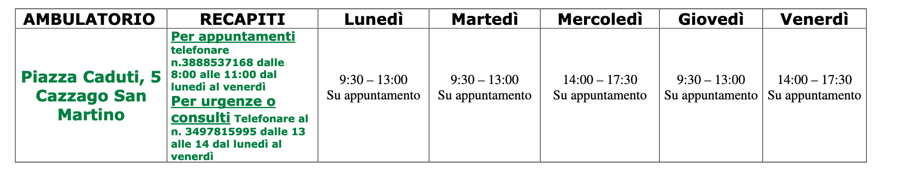 Scavuzzo svolgerà la propria attività nei seguenti giorni ed orari: