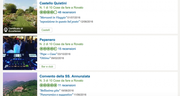 C’è chi dice che Tripadvisor sia una farsa e chi ci crede. Certo è che la classifica delle attrattività di Rovato secondo gli utenti del popolare servizio di recensioni è sorprendente. Al primo posto troviamo infatti il Castello Quistini, seguito da un locale (il Pepenero), dal Convento dell’Annunziata, la Chiesa di Santo Stefano e poi una sfilza di locali. In ordine: Bi-Kal, 105Cafè, Birreria Gigolò, Gallery Cafè, Bloody Mary Caffè e Discopub Terzo millennio. Insomma: sette attrazioni su dieci sono locali e non compaiono in alcun modo posti come piazza Cavour o il Castello con le mura venete. Colpa di Tripadvisor o colpa nostra che non le consideriamo?