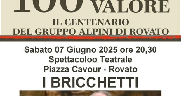 L’iniziativa, intitolata “100 anni di valore – Il Centenario del Gruppo Alpini di Rovato”, è promossa dalla Sezione ANA di Brescia, con il patrocinio della Città di Rovato e della Pro Loco, e prevede uno spettacolo teatrale con protagonisti “I Bricchetti”, amatissimo duo noto per la loro capacità di raccontare con ironia, poesia e saggezza le tradizioni e le storie della gente comune.