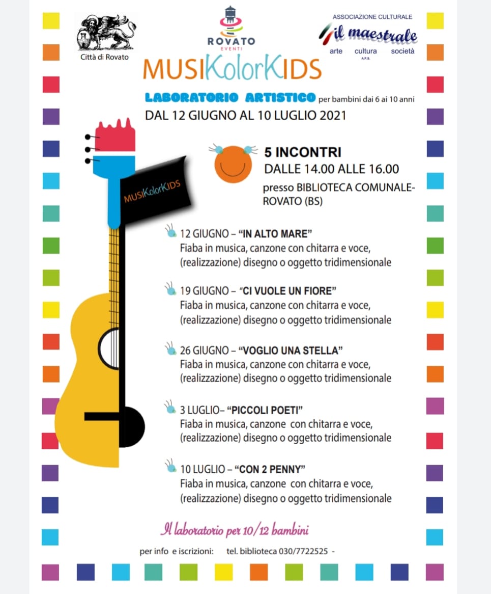 “MusiKolorKids”. E’ questo il titolo della rassegna culturale che l’amministrazione di Rovato e la biblioteca hanno deciso di mettere in campo per i bambini dai 6 ai 10 anni. Gli incontri saranno cinque: tutti dalle 14 alle 16 alla biblioteca comunale. Si parte il 12 giugno con il laboratorio artistico “In alto mare”: “fiaba in musica, canzone con chitarra e voce, realizzazione disegno o oggetto tridimensionale”. La partecipazione è gratuita, ma ogni laboratorio avrà un massimo di 12 presenti. Informazioni nella locandina qui sotto.