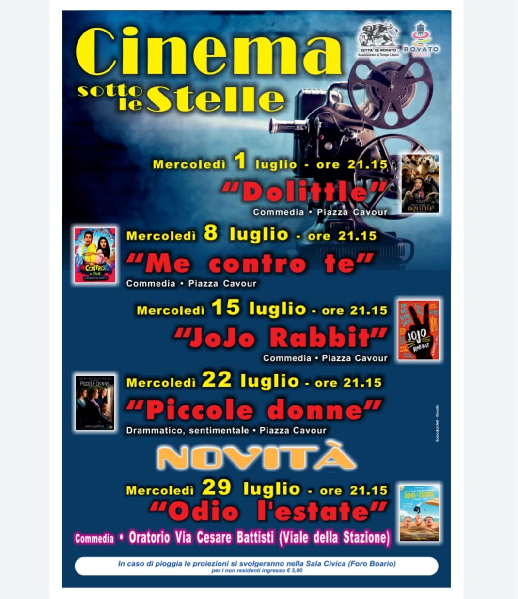 A luglio torna l’appuntamento con il Cinema Sotto le Stelle. Il programma prevede cinque proiezioni nel “salotto” della Franciacorta, piazza Cavour, che si terranno ogni mercoledì del mese dalle 21:15. Il primo appuntamento sarà il 1 luglio con la commedia Dolittle, a seguire Me contro te, JoJo Rubbit e Piccole donne. L’ingresso è gratuito per i residenti e costerà 3 euro per i non residenti.