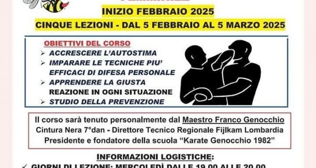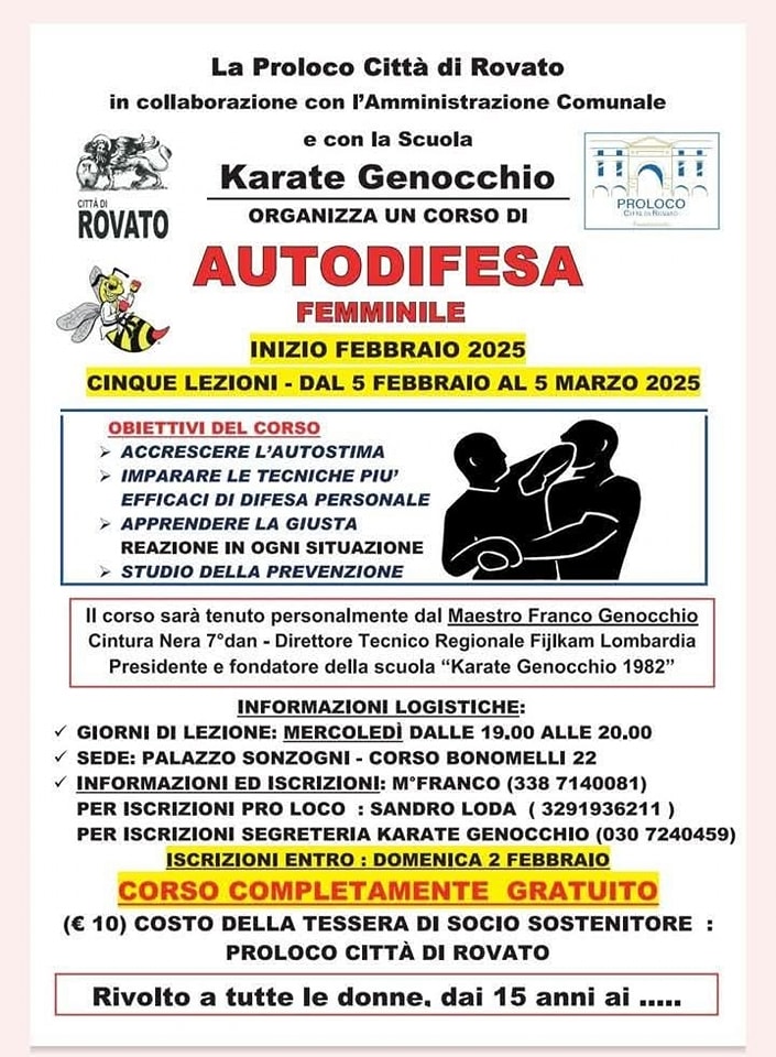 Corso di “Autodifesa Femminile” organizzato dalla Proloco Città di Rovato in collaborazione con l’amministrazione comunale e l’associazione sportiva karate Genocchio. Dal 5 Febbraio per cinque settimane tutti i mercoledì sera, dalle ore 19 presso Palazzo Sonzogni in Corso Bonomelli.