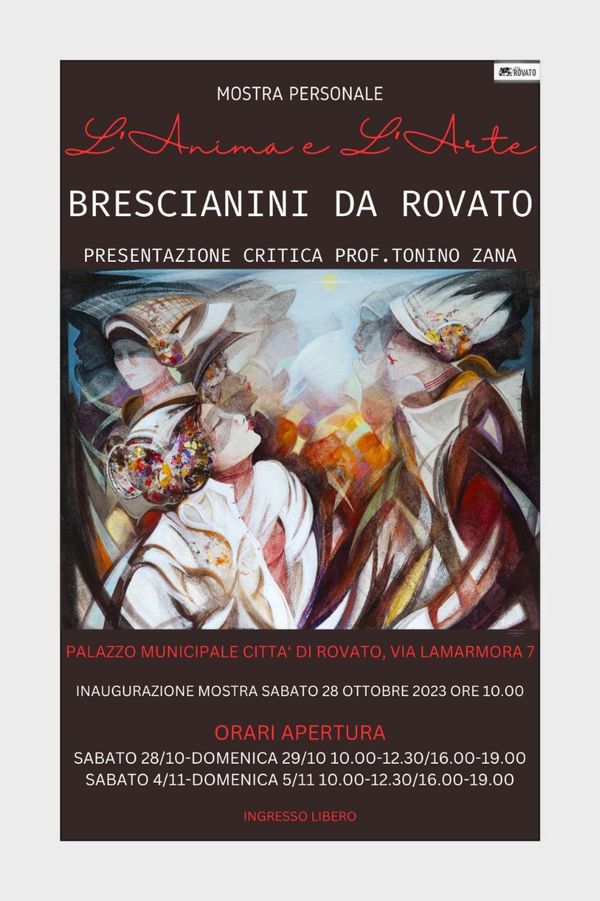 Sabato 28 Ottobre alle ore 10, nel Palazzo Comunale, si terrà l’inaugurazione della mostra personale del Maestro Brescianini da Rovato. La presentazione è affidata al giornalista Tonino Zana (Giornale di Brescia), amico personale del Maestro Brescianini.
