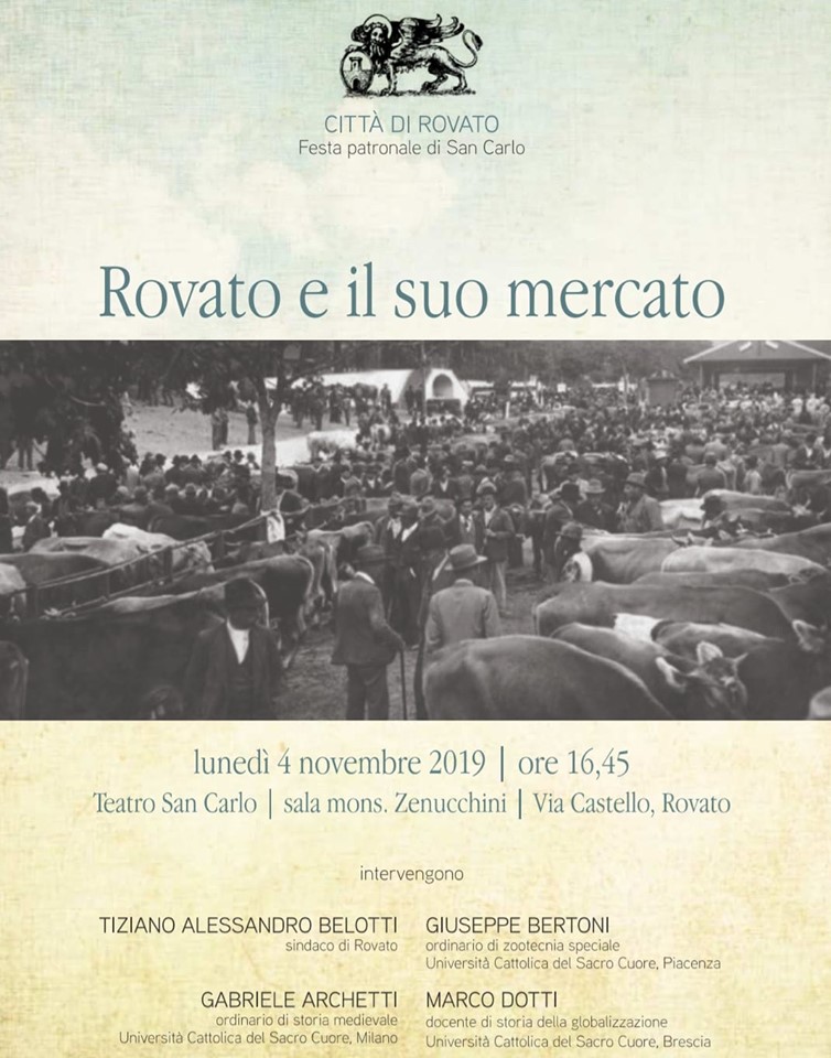 Importante dibattito, lunedì 4 novembre, a Rovato. Nell’occasione, infatti, il teatro San Carlo di via Castello – nell’ambito delle iniziative per le celebrazioni della festa del patrono – ospiterà l’incontro “Rovato e il suo mercato”. Interverranno – oltre al sindaco Tiziano Alessandro Belotti – Giuseppe Bertoni (docente di Zootecnica alla Cattolica di Piacenza), Gabriele Archetti (docente di Storia Medievale alla Cattolica di Milano) e Marco Dotti (docente di Storia della Globalizzazione alla Cattolica di Brescia). L’appuntamento, a ingresso libero, è fissato per le 16.15.