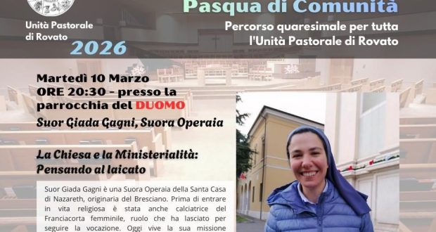 Prosegue il percorso quaresimale promosso dall’Unità pastorale di Rovato in preparazione alla Pasqua 2026. Martedì 10 marzo, alle 20.30, nella parrocchia del Duomo, è in programma un nuovo appuntamento di riflessione e confronto aperto alla comunità.
