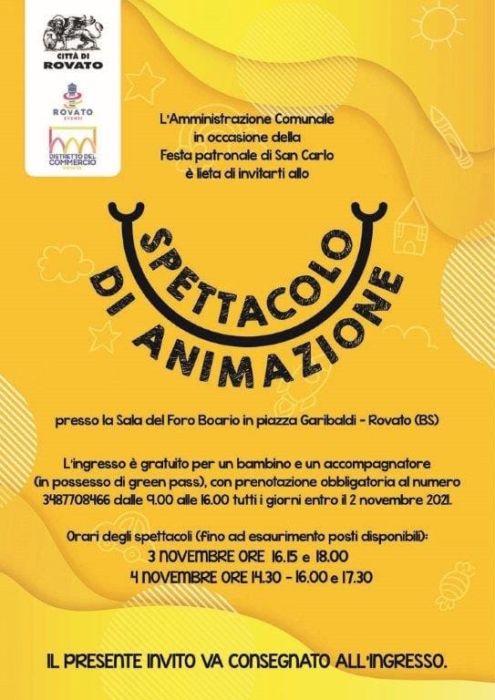 In occasione della festività del patrono cittadino S.Carlo Borromeo, l’Amministrazione Comunale ha deciso di omaggiare tutti i bambini frequentanti le scuole dell’infanzia Rovatesi, con uno spettacolo di commedia burattini, clown animatori, Ape Maia equilibrista, Mago Merlino e Trilly magia comica, Aladin e intrattenimento con pupazzi ( Teletubbies e Coniglio Bing ) nei giorni di Mercoledì 3 e Giovedì 4 Novembre. Il presente volantino verrà distribuito nei prossimi giorni in tutte le scuole dell’infanzia cittadine ed è valido come ingresso omaggio.