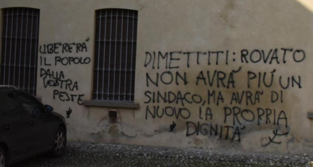 Nelle scorse ore, infatti, di fronte all’ufficio del primo cittadino Tiziano Belotti è comparso un nuovo avvertimento. “La fenice risorgerà dalle sue ceneri e libererà il popolo dalla vostra peste”, si legge. E la mano pare la stessa che poche settimane prima, sempre con bomboletta nera, aveva scritto: “Dimettiti: Rovato non avrà più un sindaco, ma avrà di nuovo la propria dignità” (con una “f” a firma in calce, accompagnata a un logo che forse rimanda a qualche sigla politica estremista). Un messaggio dai toni deliranti, quasi mafiosi. Che impone di trovare l’autore in tempi brevi per avere spiegazioni.