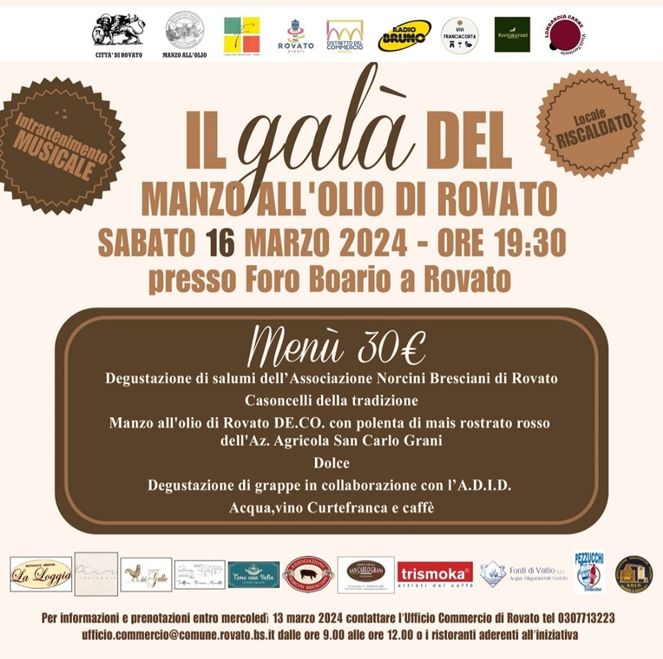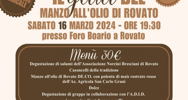 Sabato 16 marzo 2024 alle ore 19.30 a Rovato c’è il gran Galà del Manzo all’olio, piatto tipico rovatese.