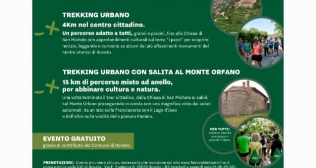 Città di Rovato è tra le 76 Città aderenti alla XXVIII°Giornata nazionale del Trekking Urbano che si terrà Domenica 31 Ottobre 2021 a partire dalle h 9.00 presso il Piazzale del Foro Boario.